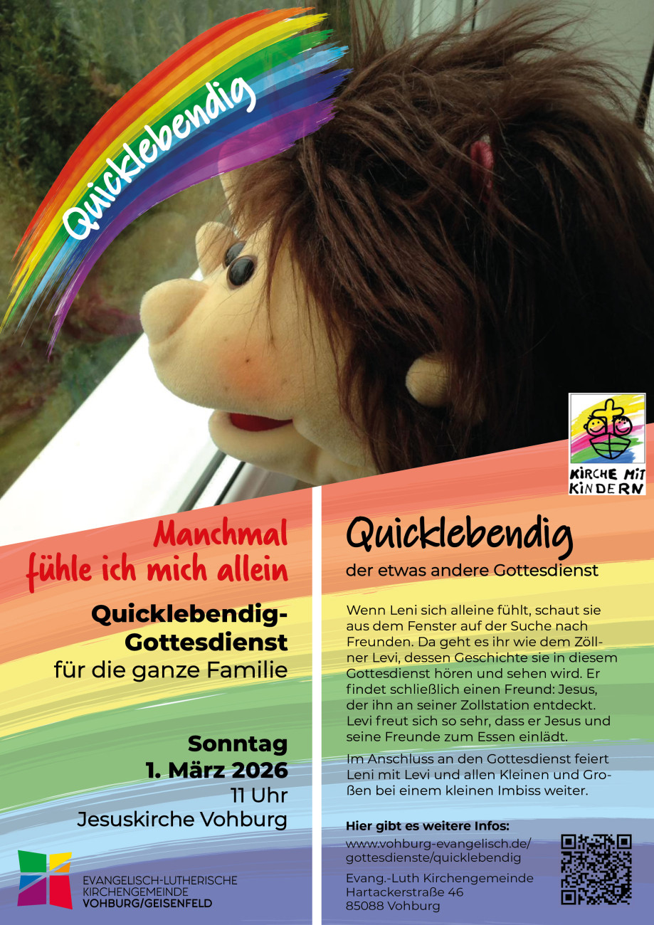 Im QuicklebendigGottesdienst am Sonntag, 1. März, 11 Uhr, in der Jesuskirche Vohburg, hört Leni vom Zöllner Levi, der sich sehr einsam fühlt. Keiner möchte mit ihm zu tun haben, weil er den Menschen an der Zollstation viel Geld abnimmt. Eines Tages kommt Jesus an sein Stadttor - und sein Leben ändert sich. Leni fragt sich: Erleben wir auch, dass wir nicht allein sind?