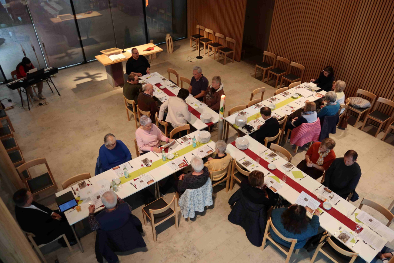 In Mittelpunkt der in Kreuzform aufgestellten Tischen in der Jesuskirche stand ie Osterkerze. Die letzten Momente von Jesus hristus gemeinsamj mit seinen Freundinnen und Freunden bildeten das Zentrum des Fewierabendmahls. Nach einer stimmungsvollen Abendmahlsfeier begleitet von Taizé-Liedern, gab es bei einer einfachen Fastenspeise (traditionell Pellkartoffwln und Kräuterquark) Gelegenheit zu anregenden Gesprächen, was von den Teilnehmenden gerne angenommen wurde.