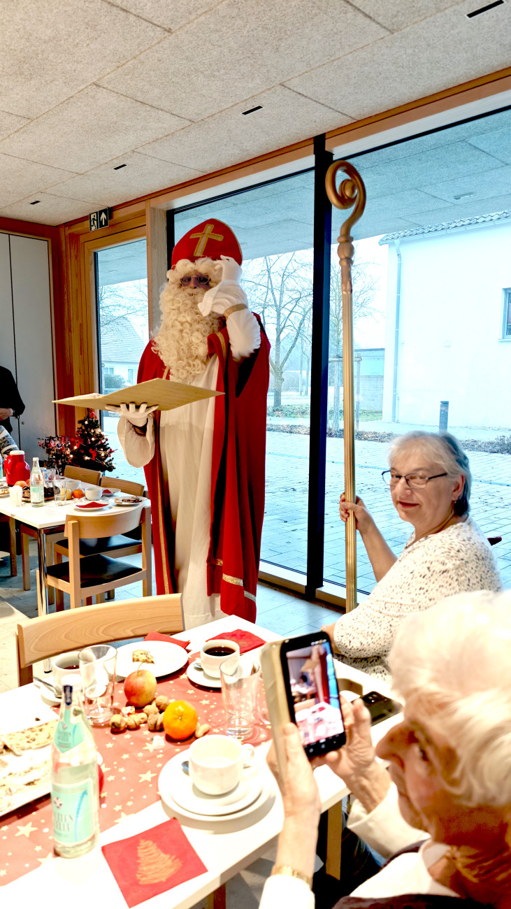 Hoher Besuch im Advent beim Seniorenkreis in Vohburg: Der Heilige Nikolaus gab sich sebst die Ehre und hatte für alle Seniorinnen und Senioren, aber auch für die Leiterinnen Ilona Bauer und Inge Lederer-Werner ein kleines Geschenk dabei. Die beiden hatten Raum und Tische wieder liebevoll adventlich geschmückt.
