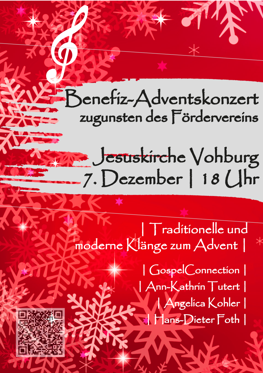 Der Verein der Freunde und Förderer der evangelischen Kirchengemeinde Vohburg e.V.  lädt ein zum Adventskonzert, das auch in diesem Jahr von den Organist*innen der Kirchengemeinde und dem Gospelchor "GospelConnection" unter der Leitung von Ann-Kathrin Tutert gestaltet wird. Am 2. Advent, Sonntag, 7.Dezember, 18 Uhr, singen und spielen sie in der Jesuskirche Vohburg bekannte Melodien, klassische Werke und weihnachtliche Chormusik.